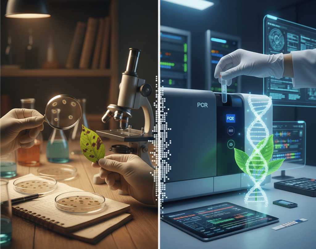 O avanço da biologia molecular nas últimas décadas mudou a capacidade de caracterização e rastrear os microrganismos, mostrando como ainda se conhece pouco sobre a diversidade microbiológica. A incorporação de técnicas moleculares e instrumentais transformou o diagnóstico fitossanitário. A PCR convencional e a PCR quantitativa (qPCR) oferecem detecção específica e sensível de alvos genéticos, permitindo tanto a identificação rápida quanto a quantificação da carga bacteriana em tecidos vegetais, ampliando o nível de espécie. Métodos multiplex, incluindo paineis de qPCR multiplex e microarrays, viabilizam a detecção simultânea de múltiplos patógenos, otimizando diagnósticos diferenciais quando sintomas são inespecíficos.